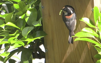 昨日までとは違い大きめの餌を運んでいるように見える、巣箱の近くに来ても警戒して中へ入らない、近所のネコの鳴き声が気になるようだ。